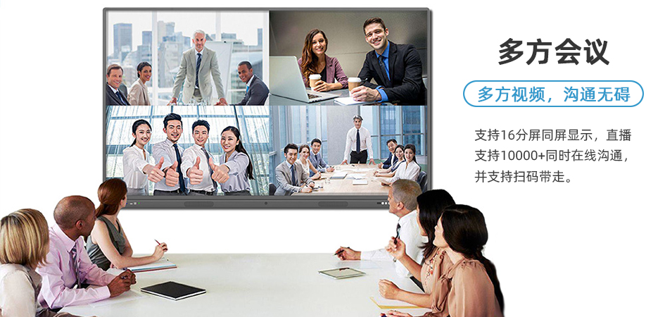 支持电脑、安卓手机、IOS、MAC OS等生态设备互联互动。最大支持16分屏同屏显示,直播情况下可以支持10000+方同时在线沟通。并支持扫码带走。